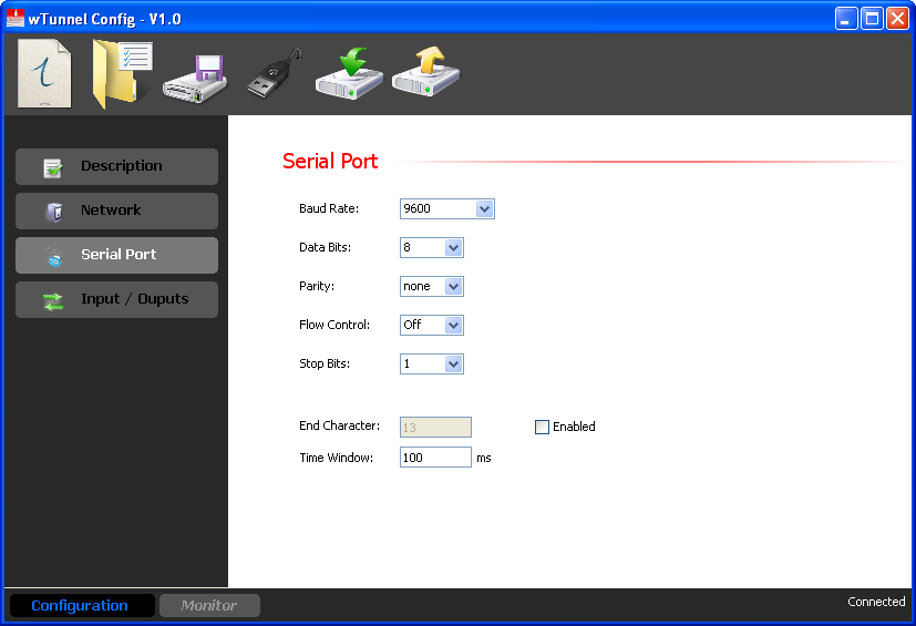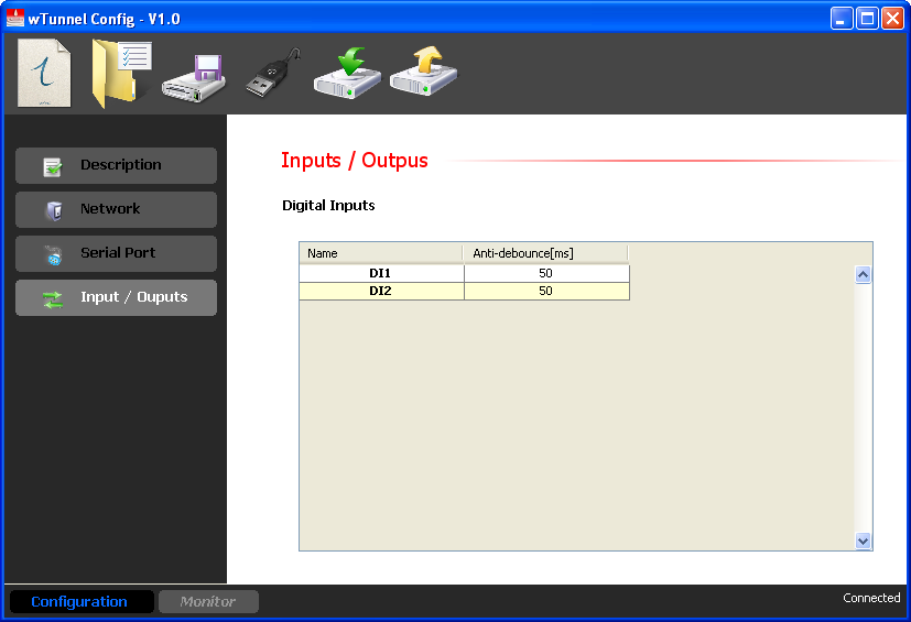 To do this, connect a device to “wTunnel Config”; go to the tab “Serial Port” to configure the serial port parameters or “Input / Outputs” to configure the inputs and outputs.