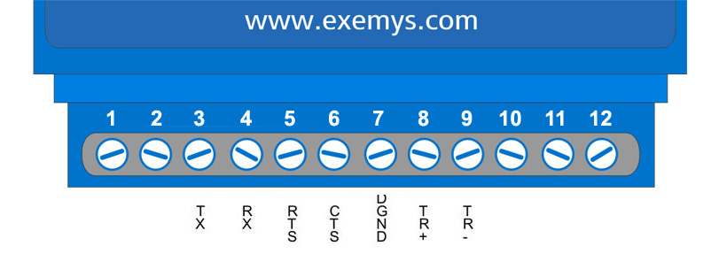 The RS232 port is of the DTE type 5-wire (TX, RX, RTS, CTS, GND) and has a terminal block for its connection, and terminals TR+ and TR- for RS485.