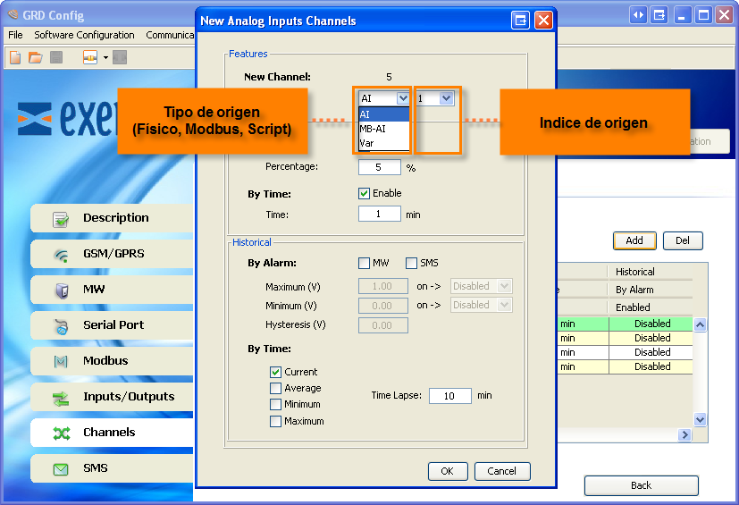 Estos canales pueden ser vinculados a entradas físicas del equipo como a consultas Modbus según la compatibilidad de estas con el canal.