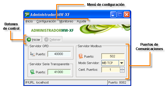 Es importante destacar que el MW funciona como un servicio de Windows. Esto quiere decir que es un programa que funciona inclusive sin que haya un usuario logueado y que no tiene una interfaz gráfica. Para configurarlo debe usar el programa Administrador MW-XF que se instala junto con el MW (O el Administrador remoto MW-XF para hacerlo desde otra computadora)