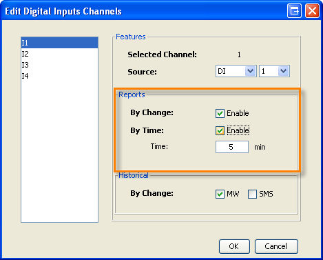 En la siguiente figura se visualiza la pantalla de configuración de los reportes de entradas digitales: