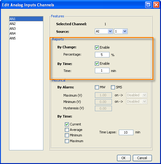 En la siguiente pantalla se visualiza la pantalla de configuración de los reportes de entradas analógicas. Las entradas analógicas cuentan con 2 tipos de reportes, por un lado reportes por cambio porcentual y por otro el reporte temporal