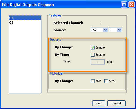 En este caso solo contamos con reporte temporal, el reporte por cambio esta siempre habilitado, esto significa que cuando se produzca un cambio en una de las salidas, el mismo, será reportado inmediatamente. El objeto de poner un reporte por cambio siempre habilitado es porque el mismo se utiliza como verificación de una activación remota.