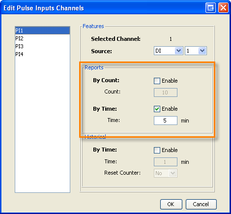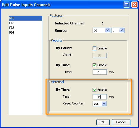 Los canales de pulsos también pueden generar Históricos en un tiempo determinado que se puede configurar en de la misma manera que en los otros canales, como se muestra en la siguiente figura. También se puede decidir si una vez generado el histórico queremos que el contador vuelva al valor 0 o no.