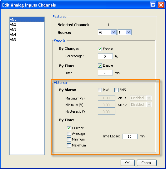 Al igual que en las entradas digitales es posible llevar un histórico de las entradas analógicas bajo dos criterios claramente definidos.