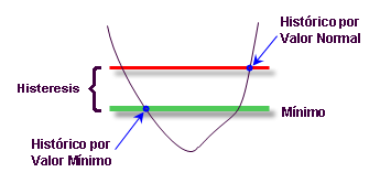Además de los máximos y los mínimos se debe definir un valor de histéresis para evitar que si la señal analógica se encuentra oscilando sobre un valor de umbral se disparen continuamente históricos. En la siguiente figura se puede ver como funciona el mecanismo de histéresis para el máximo.