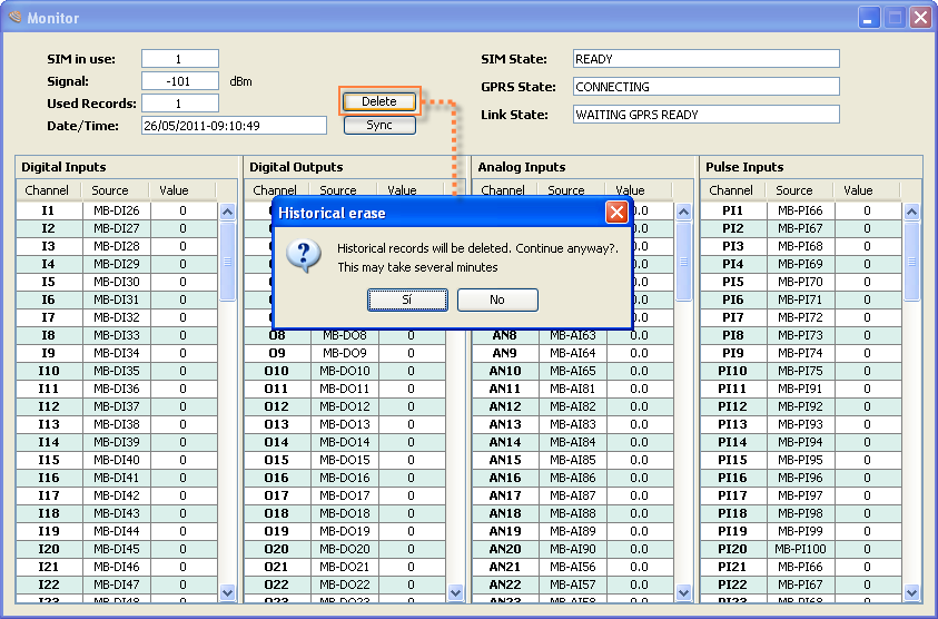 En caso de tener la necesidad de borrar los registros históricos se puede realizar mediante el “GRD Config” en la ventana de monitor con el botón “Delete” que se encuentra al lado del indicador de históricos almacenados.