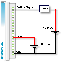 Las salidas digitales son del tipo colector abierto. La carga que se conecte debe alimentarse con una fuente de tensión externa y tienen que compartir el Terminal de GND con la alimentación del equipo. De ser necesario se puede usar la misma fuente que se utiliza para alimentar al equipo.