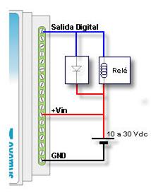 A continuación se muestra en la siguiente imagen como realizar la conexión de un relé en una salida digital del equipo: