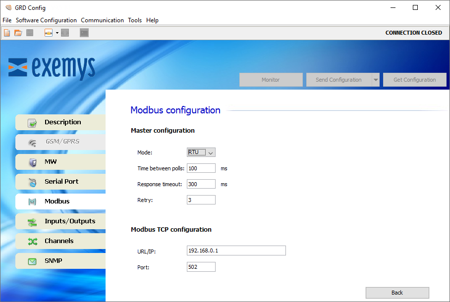 En el “GRD Config” tendremos una solapa llamada “Modbus”. Dentro de esta podremos configurar las características generales del maestro MODBUS y las Consultas.
