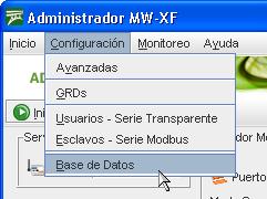 Para acceder a la pantalla de Base de datos es necesario en principio detener el MW presionando el botón de Stop en la pantalla principal, luego entramos a Configuración -> Base de Datos.