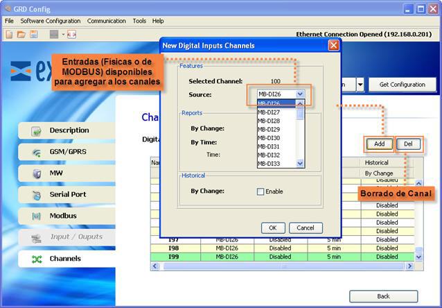 Según el modelo de GRD las entradas/salidas podrían no ser físicas y provenir de consultas MODBUS, en ese caso la vinculación seria según el tipo de consulta, por ejemplo las consultas de tipo “Coil” se podrían asociar solamente a los canales de salidas digitales, para mas información sobre los tipos de consultas y su asociación deberá consultar “Maestro MODBUS incorporado del GRD”, en este caso las entradas/salidas no serian DIx, DOx o AIx sino MB-DIx, MB-DOx o MB-AIx.