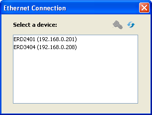 Para conectarse con el ERD debe tener conectado los equipos a una red local y presionar el botón de conectar por Ethernet, automáticamente se emprende una busqueda de todos los dispositivos conectados en esa red y se listan como se muestra a continuación.