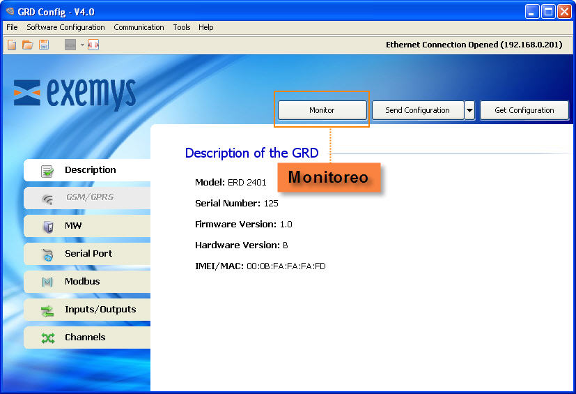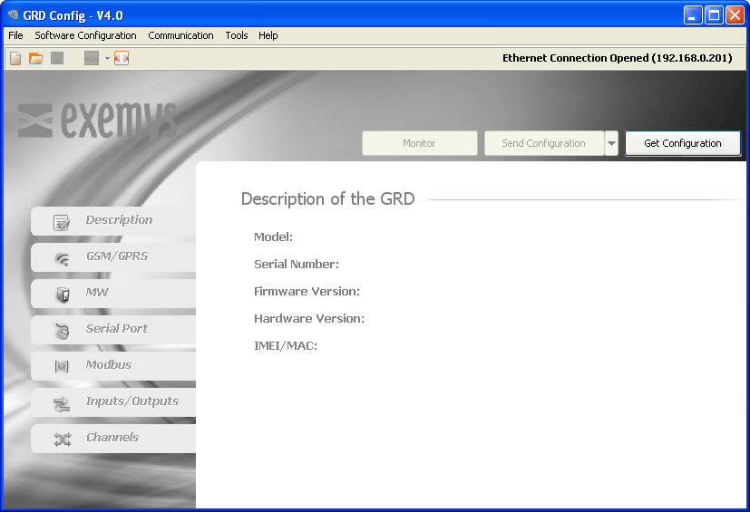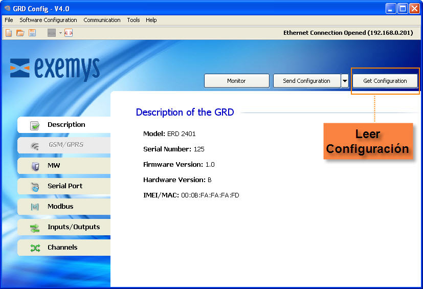 Para obtener los parámetros del equipo deberá presionar el botón “Get Configuration”, al hacerlo se descargaran todos los parámetros del ERD indicándonos en la primer pantalla el modelo, MAC address, etc.