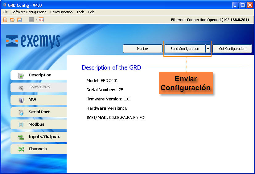 Si desea enviar al ERD algún cambio en la configuración deberá presionar el botón “Send Configuration”.