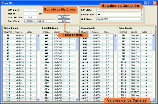 Una vez que ingresemos al monitoreo nos aparecerá la siguiente pantalla, en la que podremos ver los valores de los canales de entrada/salida, la hora, la cantidad de históricos acumulados y los estados de conexión del equipo.