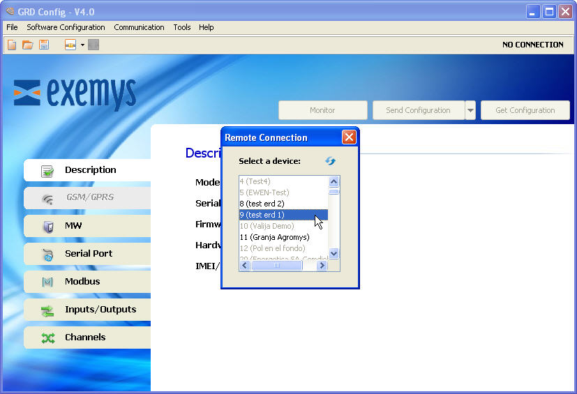 Es necesario cargar en el configurador los parámetros del MW al cual nos queremos conectar para así tener acceso remoto a los GRDs y ERDs que este tiene conectados, para ello hay que entrar a “Software Configuration -> MW Connection”