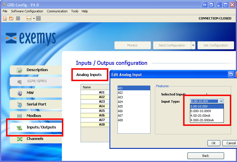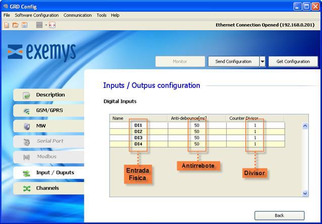 Para la configuración de los parámetros se deberá ingresar al menú “Inputs / Outputs” y alli adentro seleccionar el tipo de entrada / salida los cuales son: