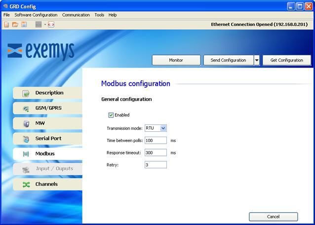 En el “GRD Config” tendremos una solapa llamada “Modbus” dentro de esta podremos configurar las características generales del maestro MODBUS y las Consultas.
