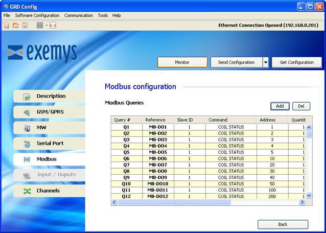 Este maestro nos permitirá cargarle un máximo de 100 consultas MODBUS a las cuales les podremos configurar ciertos parámetros. Cada una de las consultas podrá ser mapeada como un canal de entrada / salida de los tipos que dispone el ERD dependiendo de su configuración, para así poder configurarles la generación de históricos y reportes.