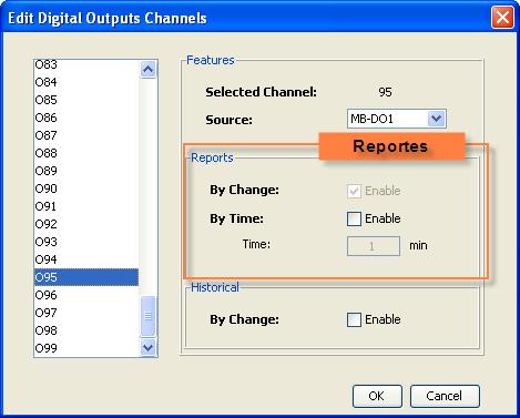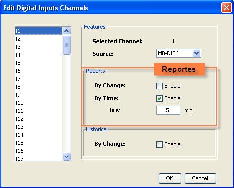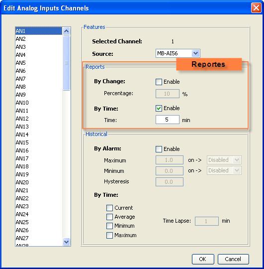 Define un tiempo en minutos que determina cada cuanto se genera un mensaje de reporte. Supongamos que nos interesa actualizar las un canal de entrada cada 5 minutos independientemente de los cambios que se produzcan, lo único que necesitamos hacer es habilitar el reporte por tiempo y configurarlo en 5 minutos, esto forzara un mensaje de reporte que actualizara el valor de la entrada en el MW cada 5 minutos.