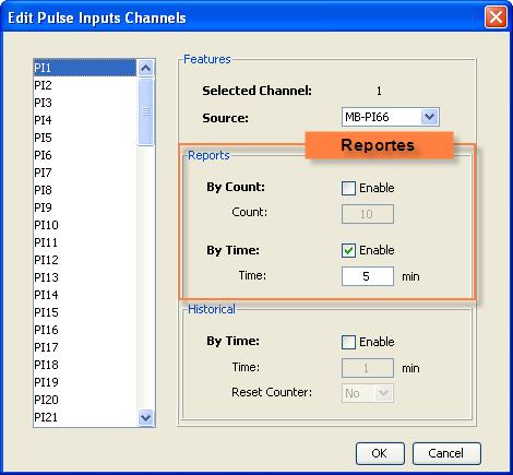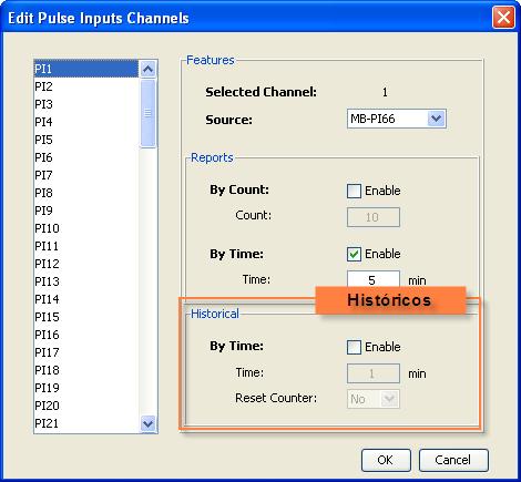 Los canales de pulsos también pueden generar Históricos en un tiempo determinado que se puede configurar en de la misma manera que en los otros canales, como se muestra en la siguiente figura. También se puede decidir si una vez generado el histórico queremos que el contador vuelva al valor 0 o no.