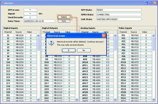 En caso de tener la necesidad de borrar los registros históricos se puede realizar mediante el “GRD Config” en la ventana de monitor con el botón “Delete” que se encuentra al lado del indicador de históricos almacenados.