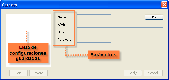 Luego nos aparecerá una ventana en la que podremos cargar un nombre para reconocer la configuración, APN, Usuario y Password.