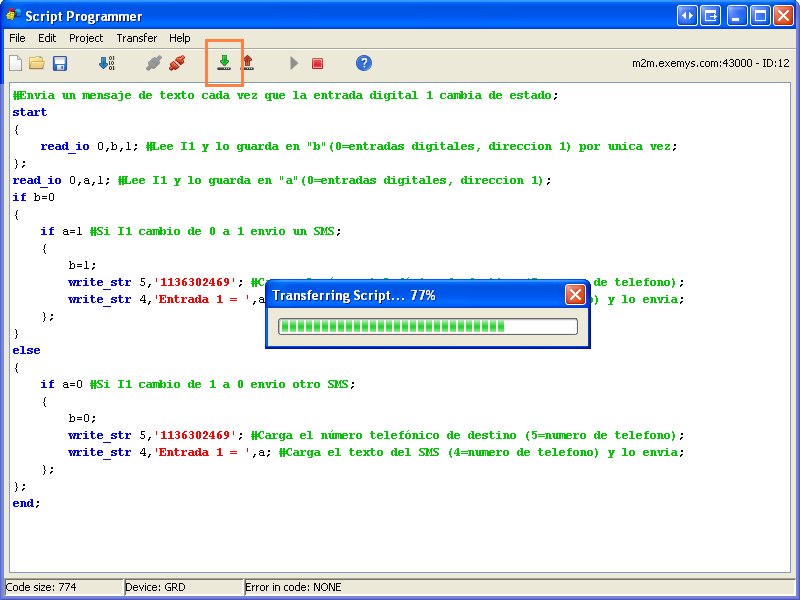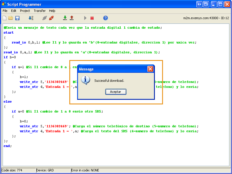 Si no tiene errores podemos, transferir el programa al equipo haciendo clic en “Download to device”. Aparecerá una ventana que nos indica el estado la descarga y luego un cartel que dice si la descarga fue exitosa o no.