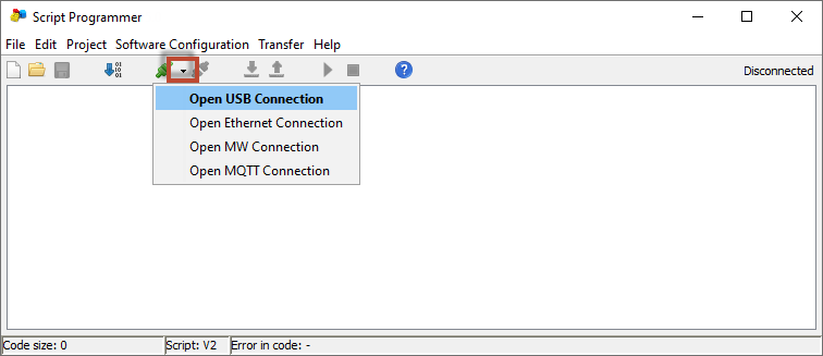 Luego desplegar el botón de Conectar y elegir "Open USB Connection"