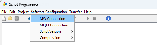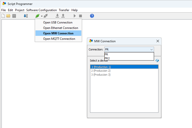 Para conectarse a un equipo de manera remota seleccionar "Open MW Connection” en el botón de conexión. Luego de esto aparecerá una ventana listando las conexiones a MW configuradas y la lista de los equipos.