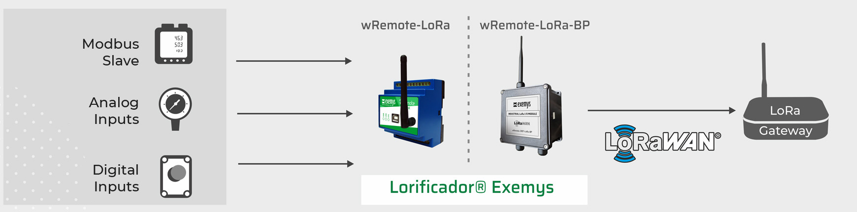 The Lorificador® Exemys is a device that converts Input signals (DI/AI) and Modbus Registers to a LoraWan network.